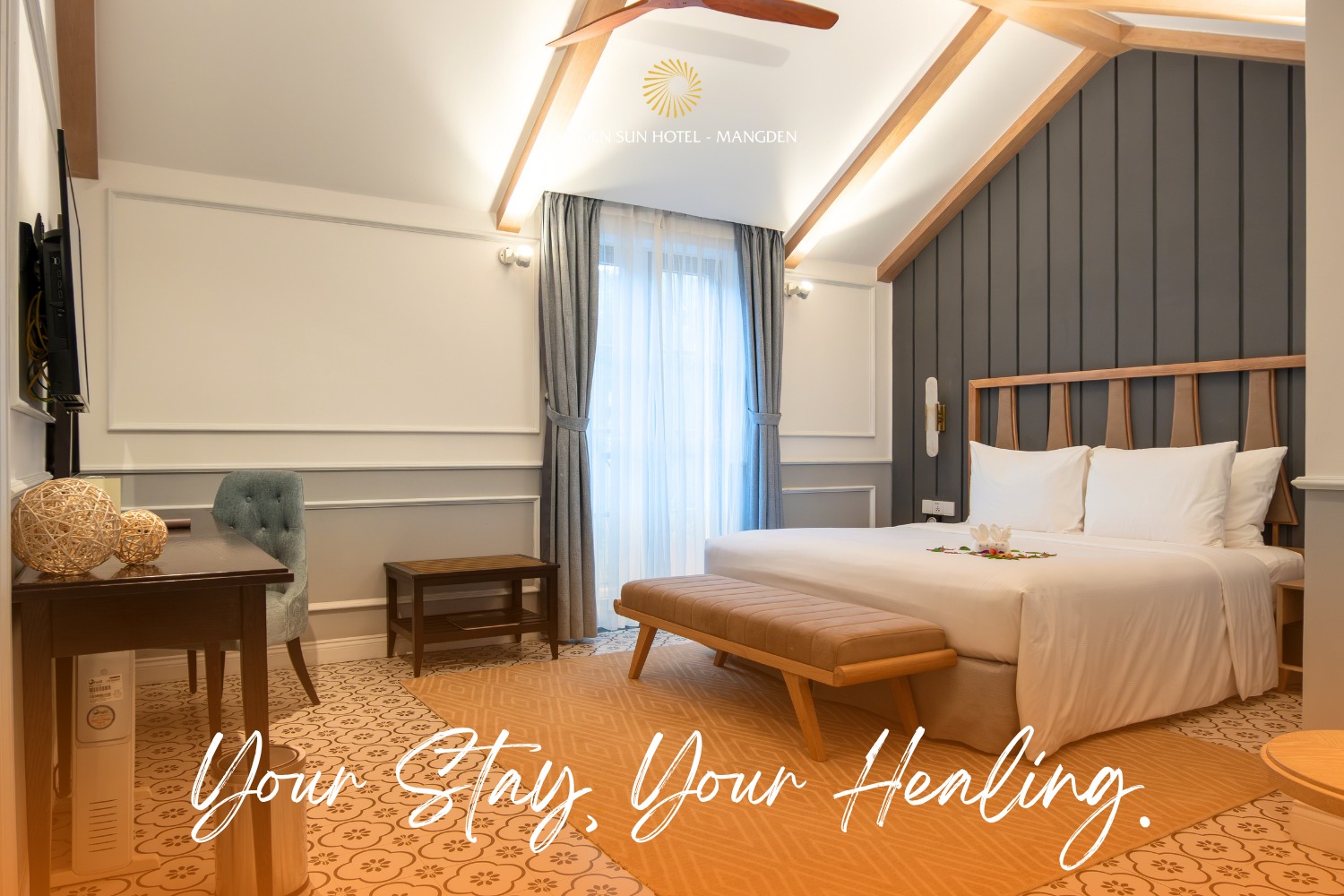 - Đặc điểm: Nổi bật với kiến trúc kiểu Pháp tinh tế và sang trọng, Golden Boutique Hotel Măng Đen tọa lạc ngay vị trí trung tâm, thuận tiện cho việc khám phá các điểm tham quan. Khách sạn cung cấp đầy đủ tiện nghi hiện đại, các phòng nghỉ được thiết kế đẹp mắt với tầm nhìn thoáng đãng, mang đến trải nghiệm lưu trú đẳng cấp cho du khách. Đây là lựa chọn lý tưởng cho các chuyến du lịch nghỉ dưỡng hoặc các gia đình muốn tận hưởng không gian riêng tư và tiện nghi cao cấp.